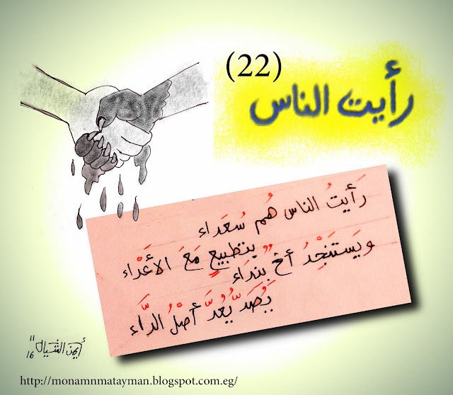 هذه الأبيات بعنوان (رأيت الناس) تعالج بعض المفاهيم والسلوكيات المعيبة في مجتمعاتنا بأسلوب نقدي للذات لاذع وكاريكاتوري .. وأوحت لي بها الأبيات الأصلية الأولي والتي اختلف في نسبتها لسيدنا علي رضي الله عنه أو للإمام الشافعي .. ولا أدعي الشعر أو الزجل ولست عالماً لأصولهما فمعذرة إن وجدتم ركاكة أو نشازا .. فهذا ما أُلهِمته واجتهدت في إخراجه قدر استطاعتي وأكون سعيداً بمن أهداني عيوبي وعرفني بها ناقدا.